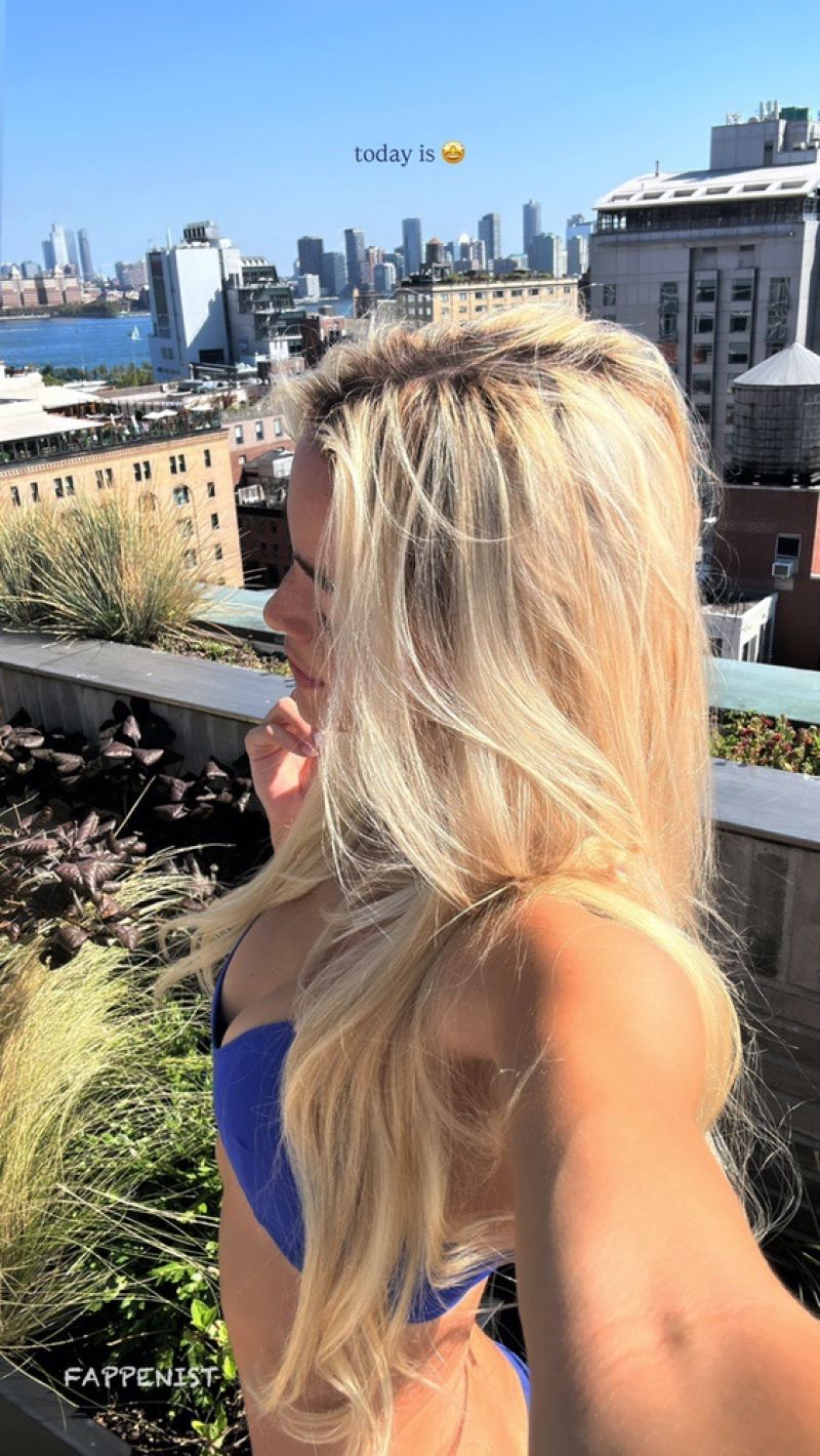 Livvy Dunne boobs showing nice cleavage with her tits and tight model body taking a selfie on her balcony in a sexy blue bikini.