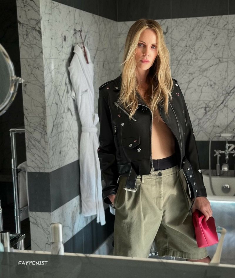 Charlize Theron braless boobs showing nice cleavage with her big tits barely covered going topless in just an open jacket.