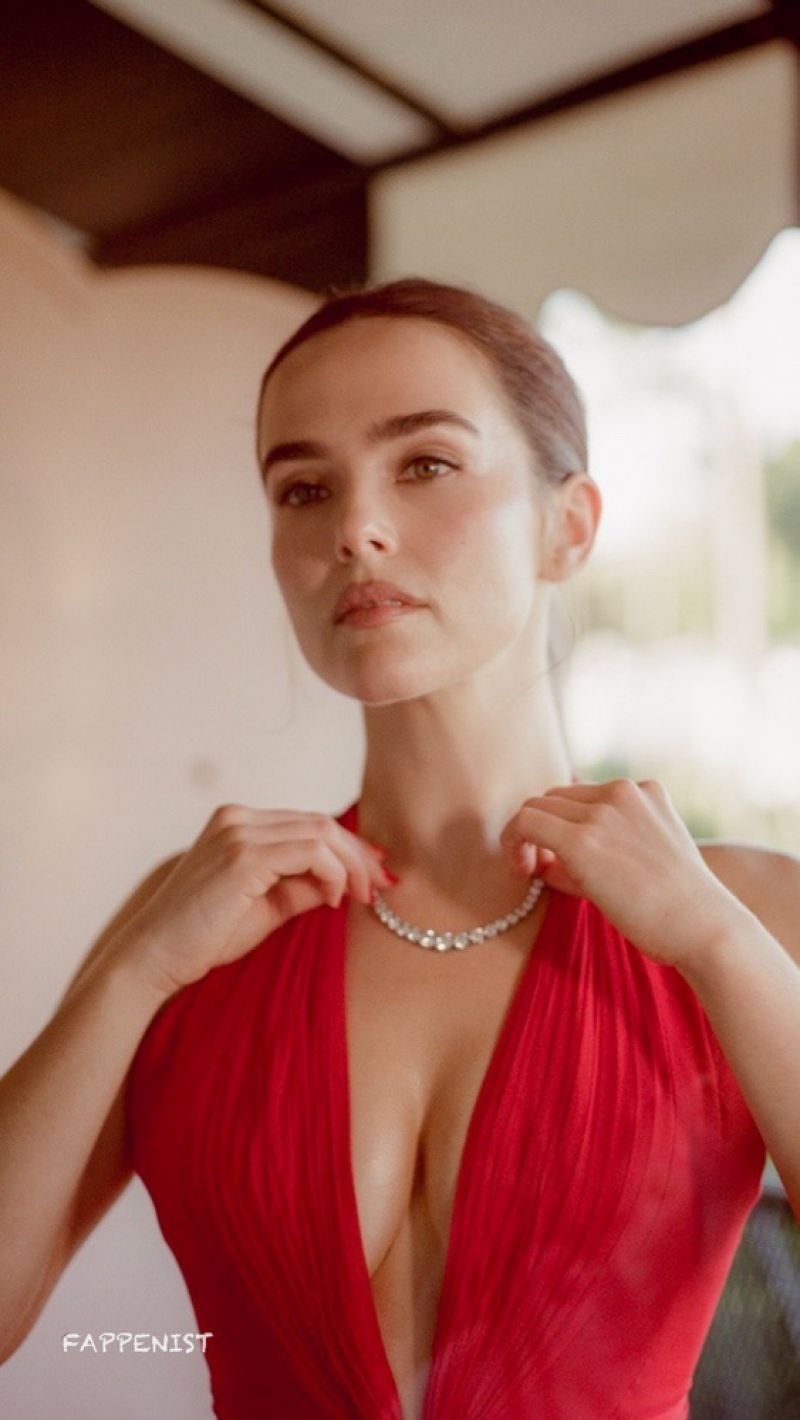 Zoey Deutch braless boobs showing incredible deep cleavage with her big tits in a very low cut sexy revealing red dress while getting ready for the 2025 Academy Museum Gala.