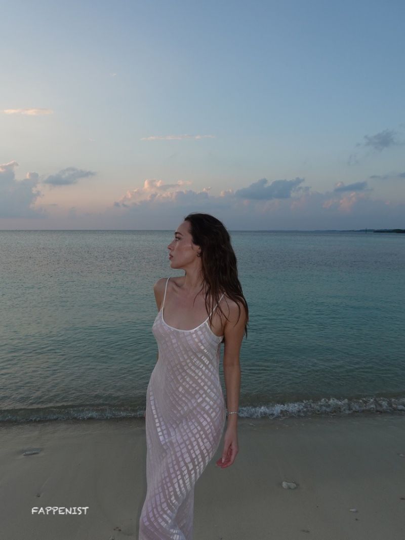 Alycia Debnam-Carey braless boobs showing nice cleavage with her big tits in a sexy see through dress with her nipples visible at the beach on vacation.
