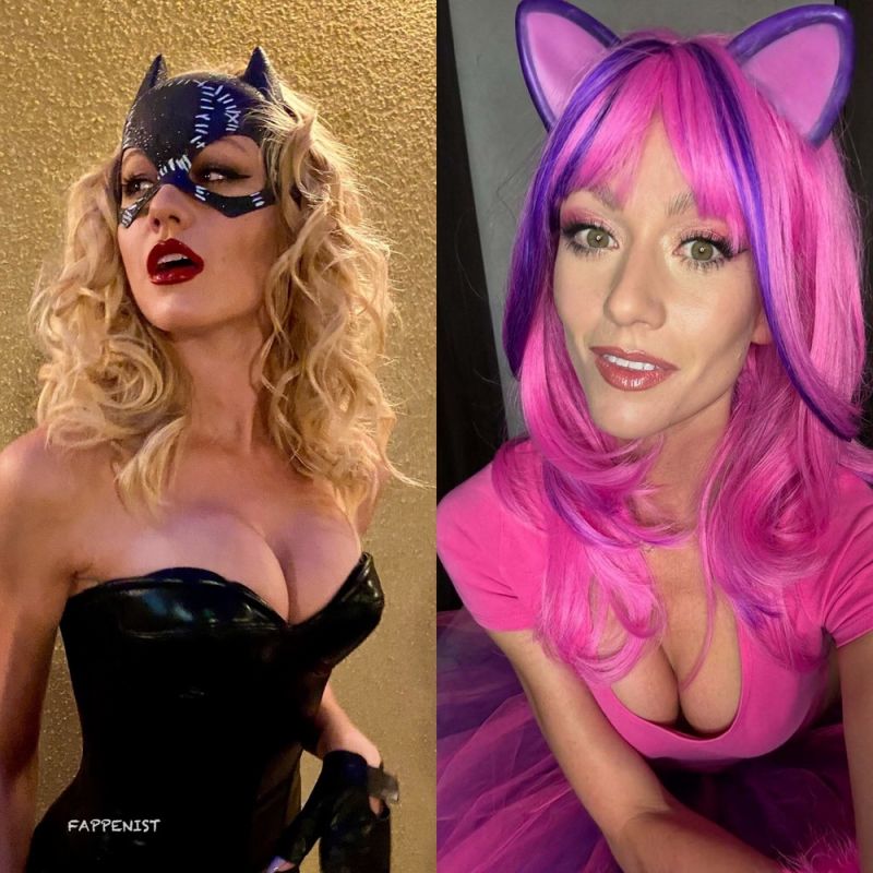 Katherine McNamara braless boobs showing incredible cleavage with her big tits in three different sexy 2025 Halloween costumes this year.