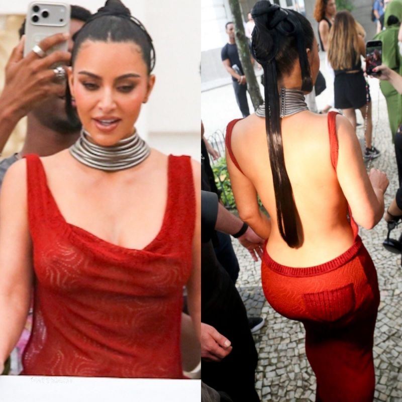 Kim Kardashian braless boobs in a sexy revealing see through backless red dress showing off her big tits and hot ass with her nipples visible photographed by paparazzi in Rio.