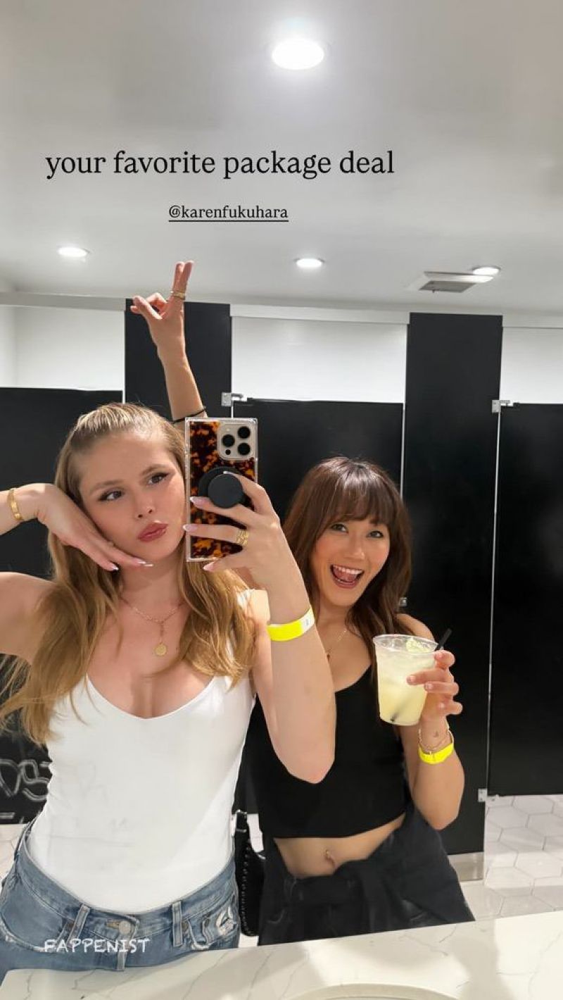 Erin Moriarty and Karen Fukuhara braless boobs showing nice cleavage with their tits in sexy tank tops taking selfies together in the bathroom.